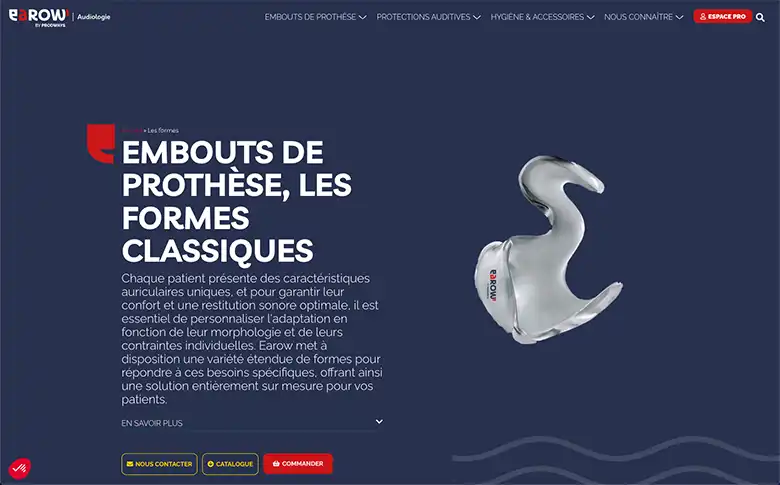 Création d'une plateforme en ligne dédiée aux audioprothésistes, offrant un catalogue détaillé d'embouts de prothèse sur mesure et de protections auditives personnalisées.